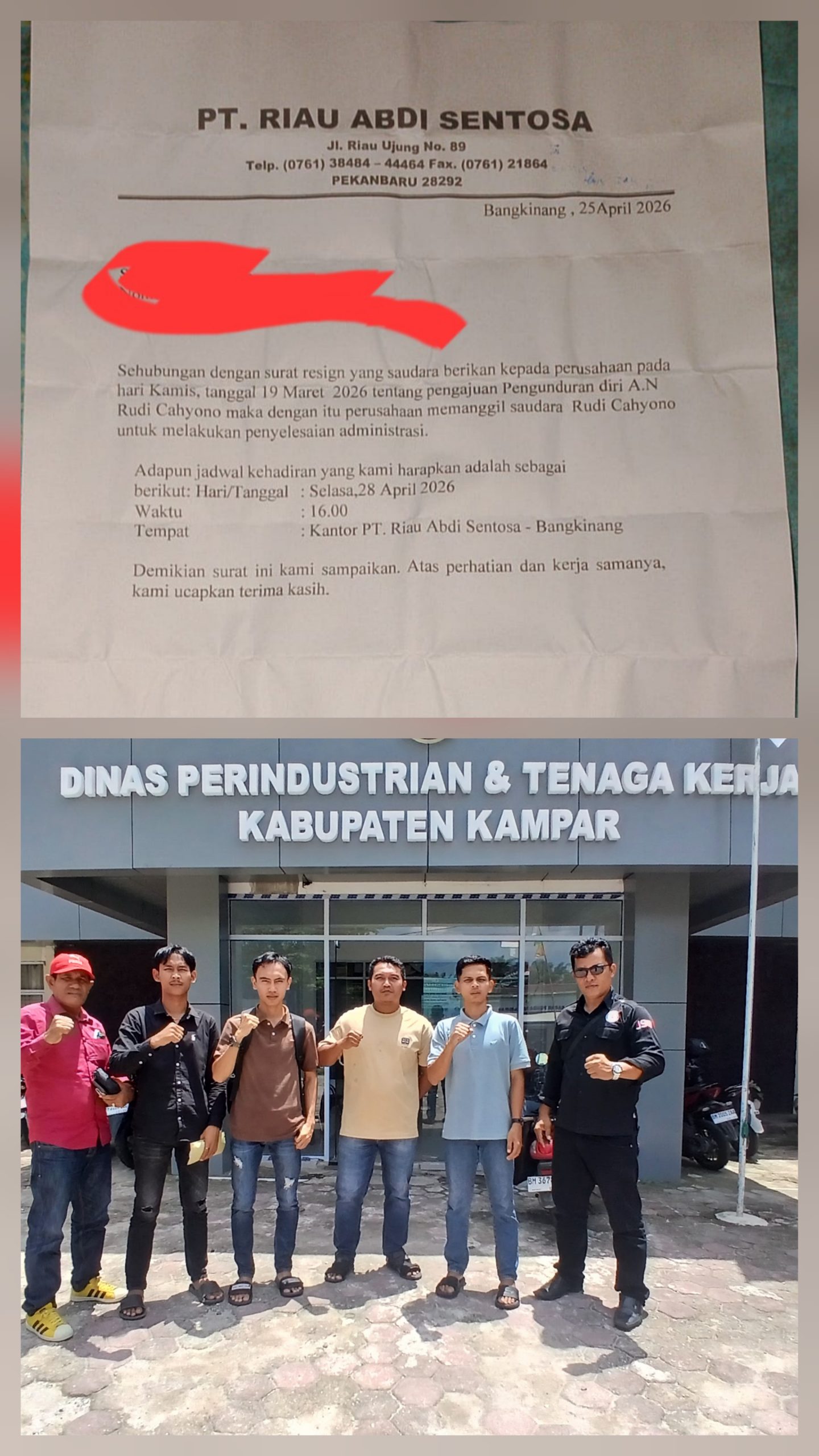 Surat pemanggilan yang diterbitkan pada 25 April 2026 di Bangkinang itu menjadi titik terang setelah para mantan pekerja memperjuangkan hak mereka. Dalam surat tersebut, salah satu mantan karyawan, Rudi Cahyono, diminta hadir untuk proses penyelesaian administrasi di kantor perusahaan.