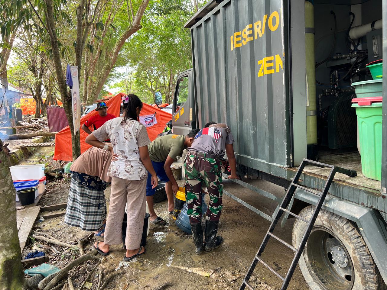 Menggunakan alat zeni andalan berupa mobil Reverse Osmosis (RO), prajurit TNI mengolah air di sekitar lokasi bencana menjadi air layak konsumsi. Teknologi ini menjadi penopang vital di saat akses air bersih lumpuh dan warga harus bertahan dalam kondisi serba terbatas.