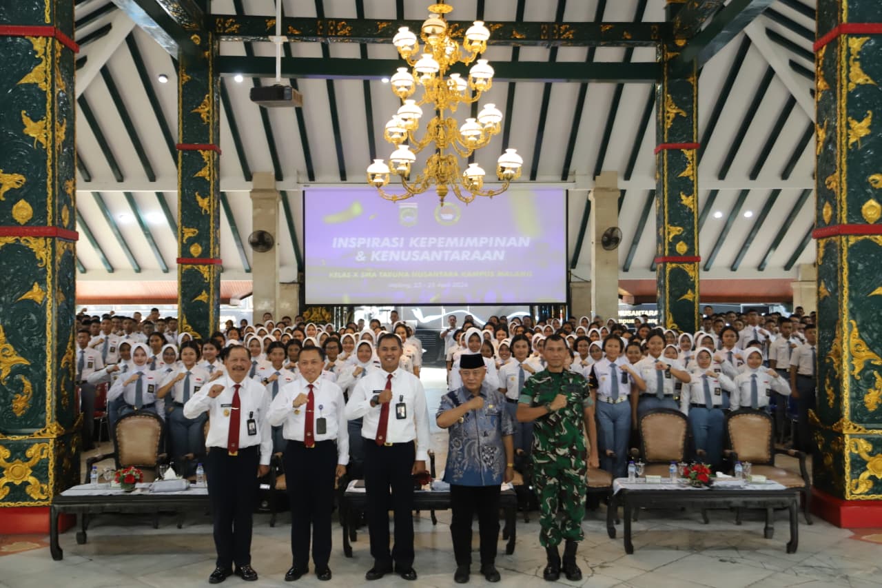 SUARARAKYAT62, MALANG – Bupati Malang, Sanusi, memberi pembekalan kepada siswa kelas X SMA Taruna Nusantara Kampus Malang di Pendopo Agung Kabupaten Malang, Kamis (23/4/2026). Pembekalan ini bagian dari kegiatan studi wisata Tahun Pelajaran 2025/2026.