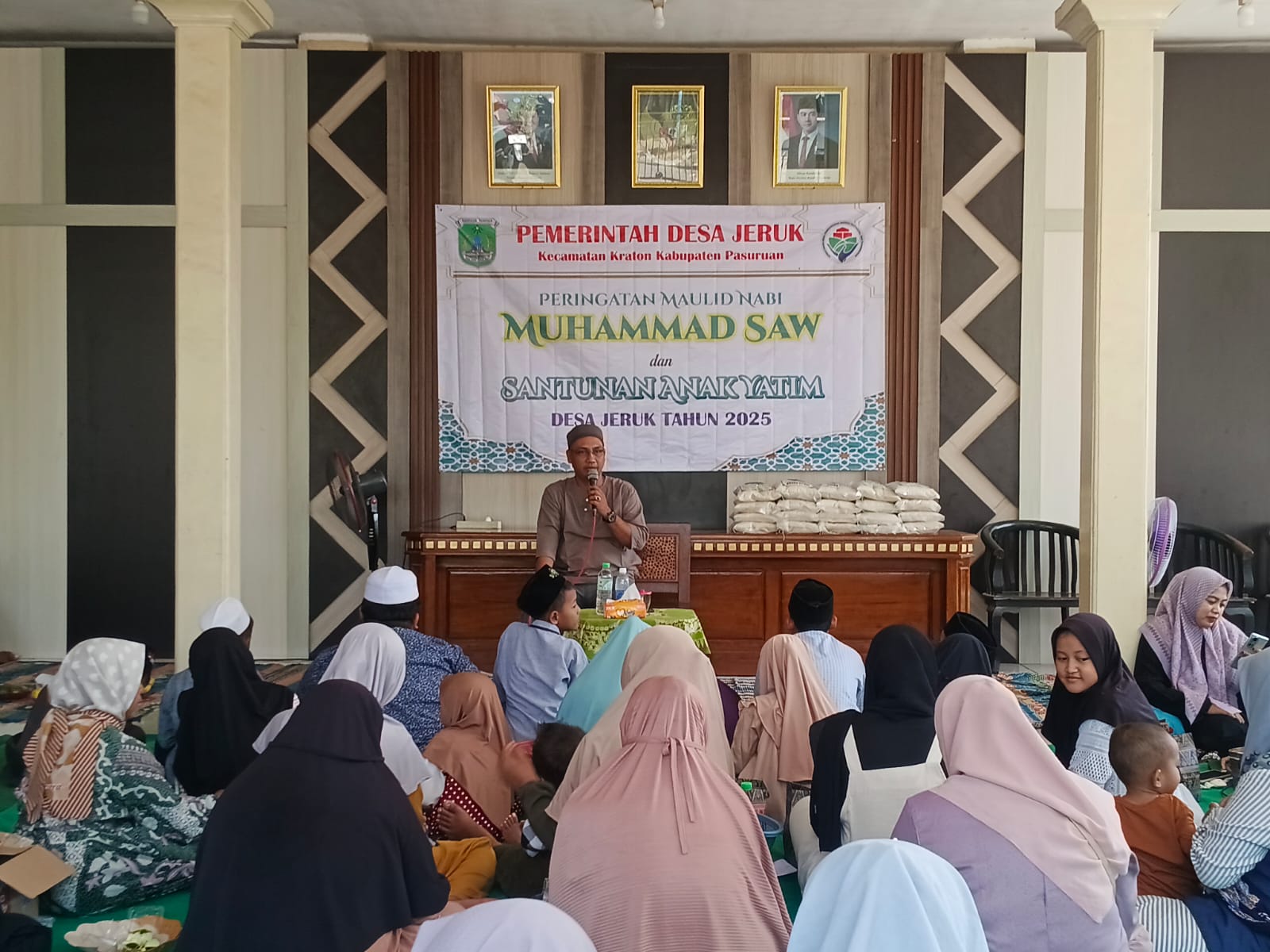 Kepala Desa Jeruk menyampaikan bahwa peringatan Maulid Nabi bukan sekadar seremoni, tetapi juga momentum untuk memperkuat iman dan menumbuhkan kepedulian sosial.