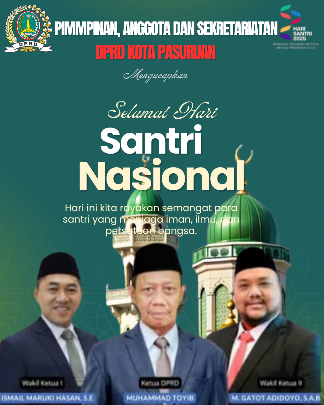 “Atas nama pimpinan, seluruh anggota, dan Sekretariat DPRD Kota Pasuruan, kami mengucapkan Selamat Hari Santri Nasional 2025. Semoga semangat jihad, ilmu, dan pengabdian para santri menjadi cahaya penerang bagi bangsa menuju Indonesia yang berkarakter, berkeadilan, dan bermartabat,” pungkas Muhamad Toyib.