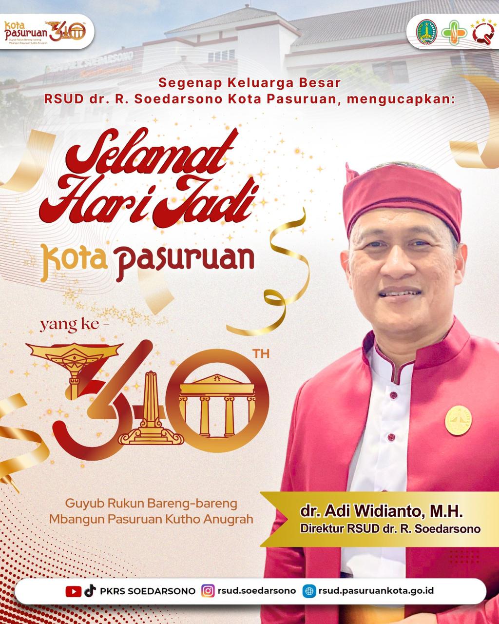 Sebagai bentuk partisipasi dan dukungan penuh terhadap peringatan Hari Jadi ke-340, segenap keluarga besar RSUD dr. R. Soedarsono Kota Pasuruan mengucapkan Selamat Hari Jadi ke-340 Kota Pasuruan, seraya menyatakan kesiapan untuk terus bersinergi dan berkontribusi aktif dalam membangun Pasuruan sebagai Kutho Anugrah yang sehat, tangguh, dan berdaya saing.