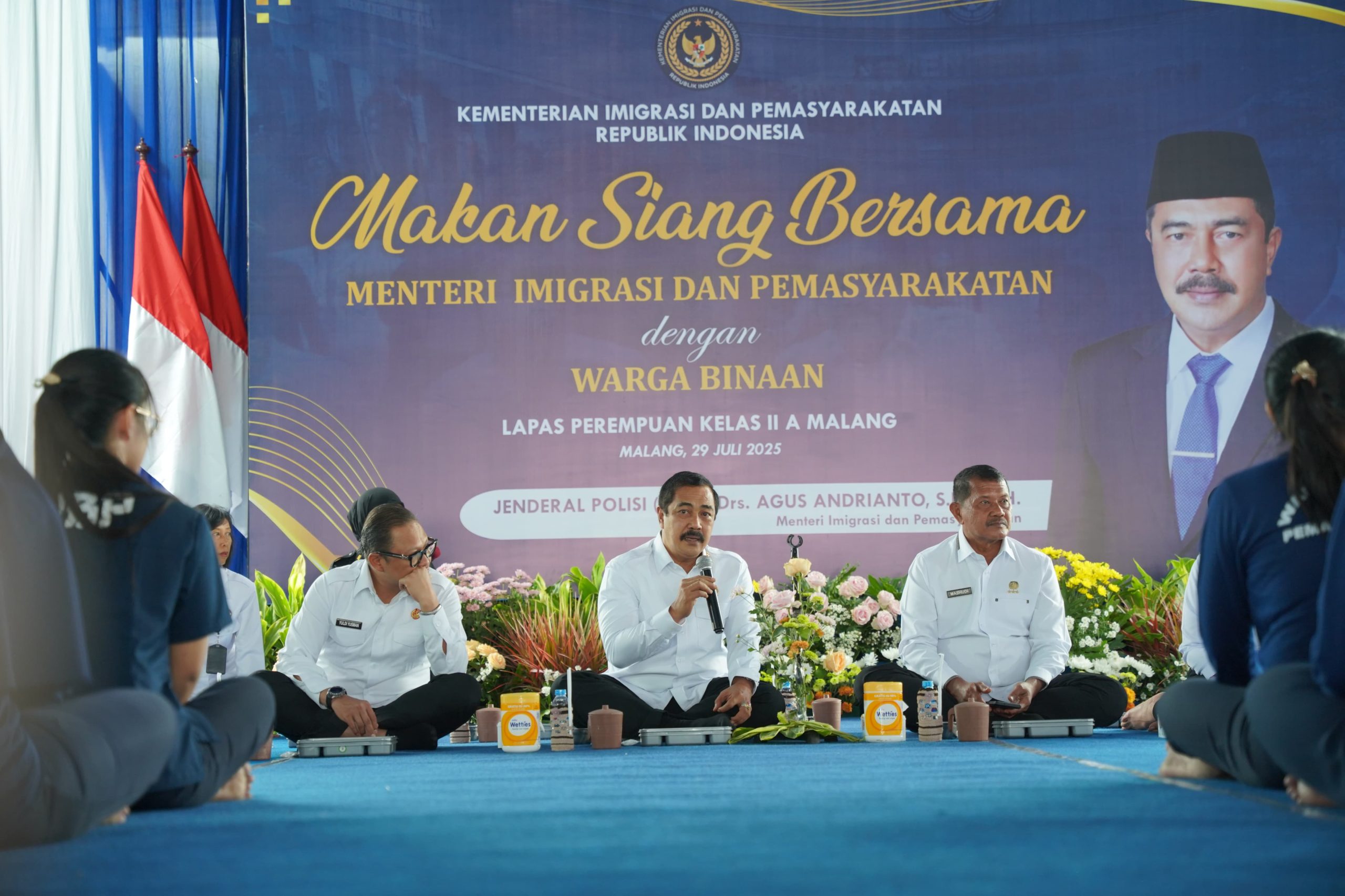 Malang, SuaraRakyat.com — Suasana hangat penuh keakraban tercipta di Lapas Perempuan Kelas IIA Malang, Selasa (29/7/2025), saat Menteri Imigrasi dan Pemasyarakatan Agus Andrianto duduk lesehan dan makan siang bersama para warga binaan.