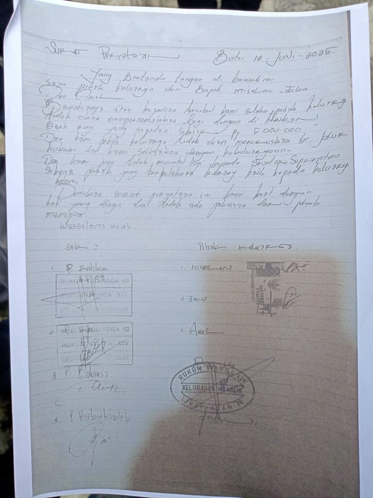 Menurut Andi, intimidasi terhadap keluarga korban dilakukan dengan dalih “uang damai”, bahkan melibatkan oknum RT, RW, Babinsa, dan Bhabinkamtibmas yang ikut menandatangani surat pernyataan.