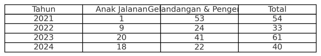 Data tersebut menunjukkan bahwa meski jumlah gelandangan dan anak jalanan sempat menurun pada 2024, persoalan sosial ini belum sepenuhnya tuntas. Bahkan, masih rentan berulang jika tidak ditangani dengan serius.