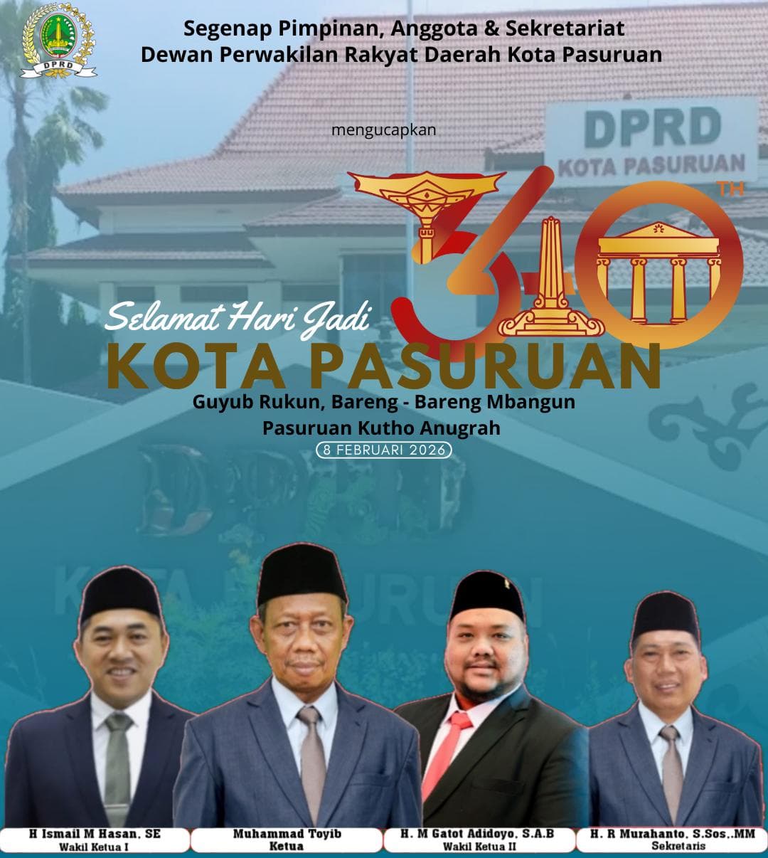 Dewan Perwakilan Rakyat Daerah (DPRD) Kota Pasuruan memaknai Hari Jadi ke-340 sebagai ajang memperkuat komitmen kebijakan yang berpihak kepada kepentingan masyarakat. DPRD menilai bahwa nilai guyub rukun harus diwujudkan secara nyata melalui kolaborasi antara legislatif, eksekutif, dan partisipasi aktif masyarakat.