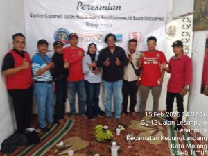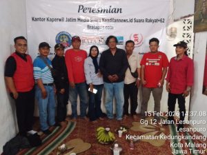 Kota Malang, SuaraRakyat62.com – Dalam suasana penuh kebersamaan dan rasa syukur, Kabiro Malang Raya media Suararakyat+62.com menggelar acara tasyakuran atas peresmian kantor Kaperwil Jawa Timur bagi media Suara keadilannews.id, Bratapos.com, dan Suararakyat62.com. Acara berlangsung pada Minggu (15/02/2026) siang, bertempat di Jalan Ki Ageng Gribik Gunung 12, RT.03 RW 05, Kelurahan Lesanpuro, Kecamatan Kedungkandang, Kota Malang, Jawa Timur.