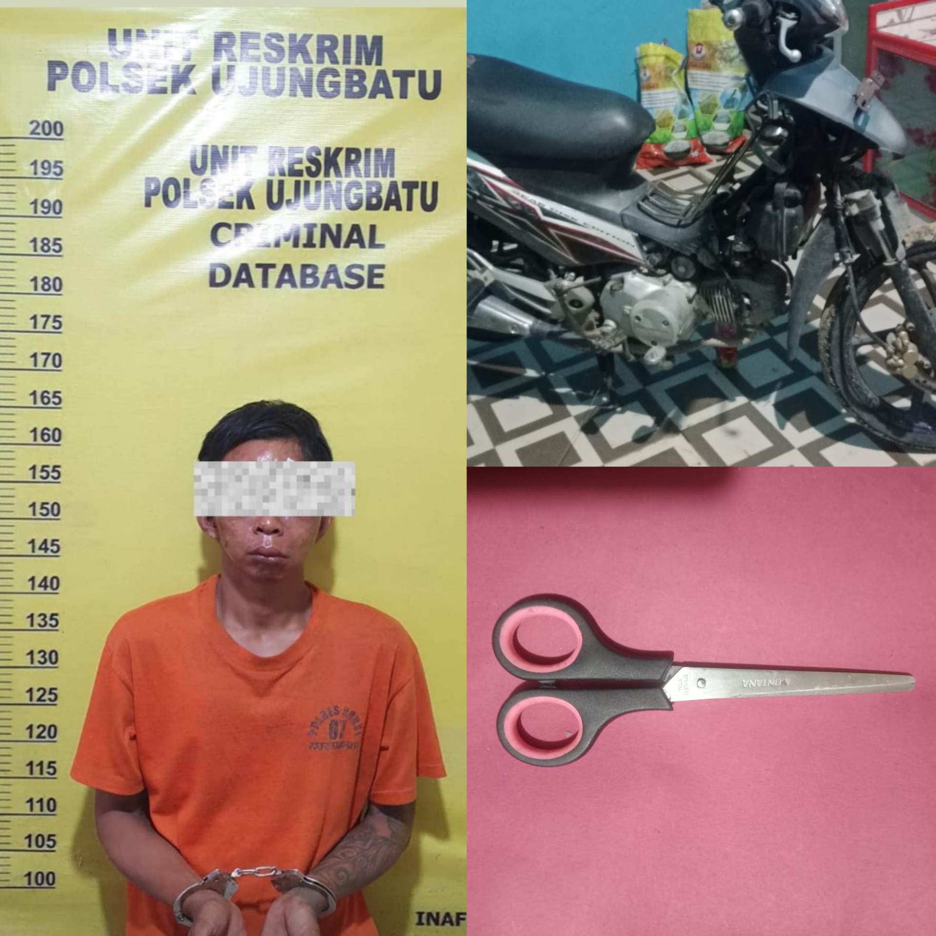 Dari tangan pelaku, polisi menyita barang bukti berupa sepeda motor Honda Supra X 125 dan sebuah gunting yang digunakan saat beraksi. Saat ini, RA sedang menjalani pemeriksaan intensif di Polsek Ujung Batu dan telah ditetapkan sebagai tersangka sesuai Pasal 363 KUHP tentang pencurian dengan pemberatan.