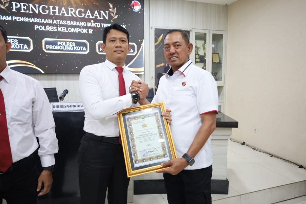 Penghargaan tersebut diserahkan langsung oleh Dirresnarkoba Polda Jatim, Kombes Pol. Robert Da Costa, S.I.K., M.H., kepada Kasatresnarkoba IPTU Arief Wardoyo, S.H., M.H., pada Rabu (11/6/2025), di ruang rapat Ditresnarkoba Polda Jatim.