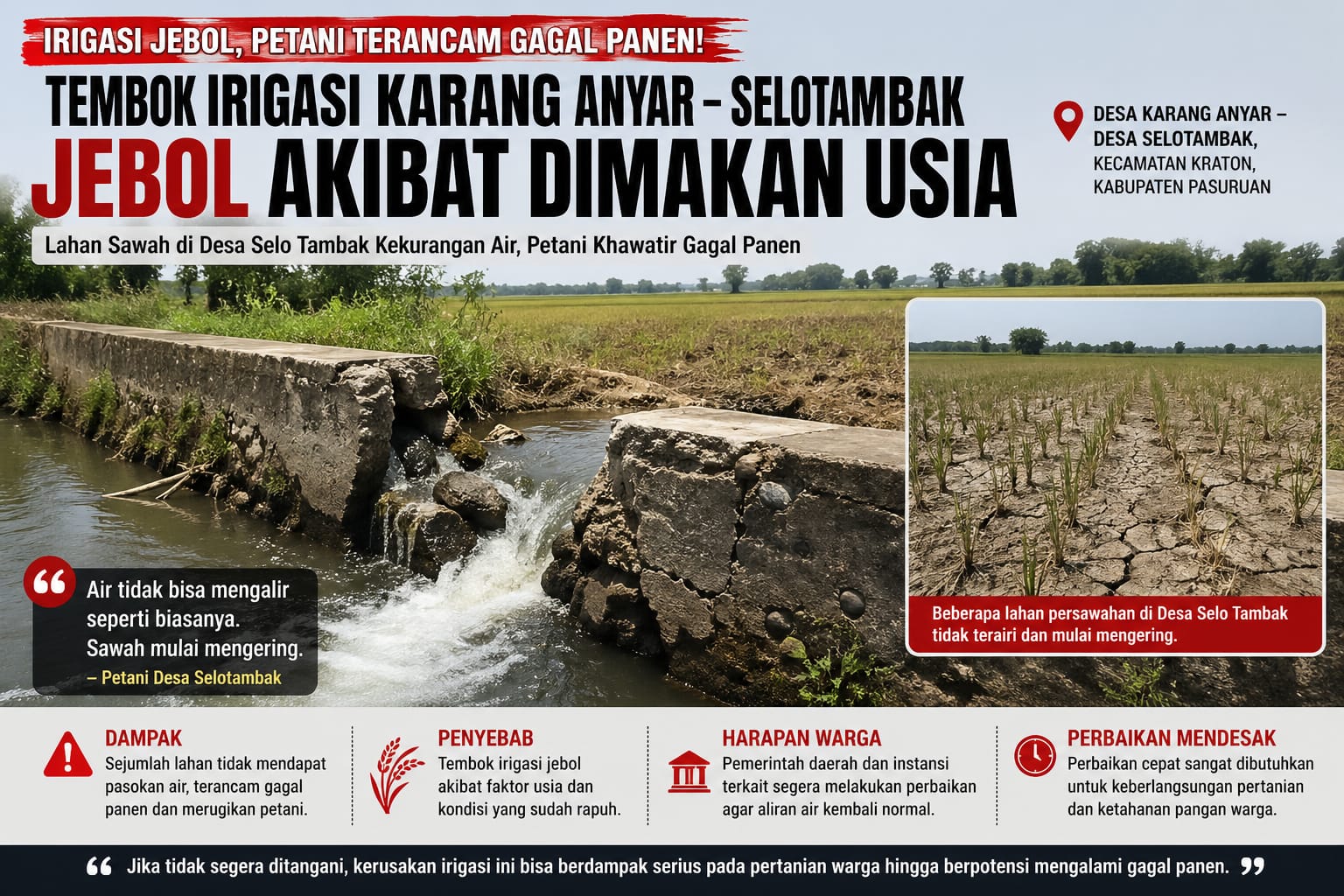 Tembok saluran irigasi yang menghubungkan Desa Karang Anyar menuju Desa Selotambak, Kecamatan Kraton, dilaporkan jebol akibat faktor usia. Kerusakan tersebut kini berdampak langsung pada aliran air ke area persawahan warga, Selasa (28/4).